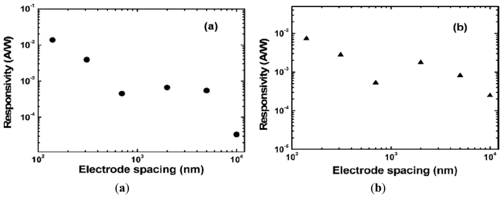 We fabricated MSM photodetectors with electrode spacing from 0.14 to 10 μm on a homoepitaxial diamond thin film grown on a Ib-type diamond substrate [93]. A dramatic increase of the deep ultraviolet responsivity is observed when the electrode spacing is scaled down. The reduction in the electrode spacing enables the full depletion of the spacing at low biases, providing a higher responsivity without sacrification of the response speed. Due to the low flatband voltage for the small electrode spacing, the EQE is significantly enhanced from around 0.02% to 8% as the spacing scales from 10 to 0.14 μm at a fixed voltage of 1 V, as shown in Figure 13a. The dramatic increase of the responsivity with the spacing reducing was also observed for a fixed electric field of 2 × 104 V/cm (Figure 13b).