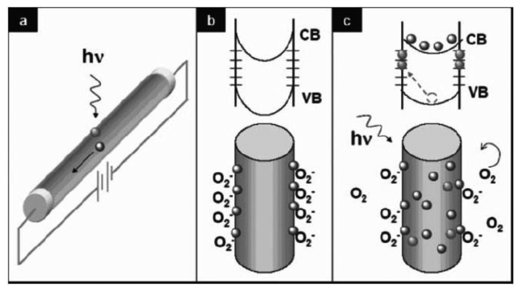 Because of the high surface-to-volume ratio, and superior properties, ZnO has been widely developed for nanometer-scale visible-blind UV-light detection with a high sensitivity and selectivity. The photoconduction mechanism in a nanowire is shown in Figure 15[105]. When the nanowire is upon the UV light illumination, the electron-hole pairs are generated. Holes are trapped at the surface due to the surface trap states (oxygen molecules which are absorbed at the surface). Under the applied voltages, the unpaired electrons are collected at the anode, increasing the conductivity. The first individual ZnO-based nanowire photodetectors were reported by Yang et al. in 2002 [106]. The conductivity of the ZnO nanowires was extremely sensitive to UV light exposure (365 nm), with a typically four to six orders of magnitude decrease in the resistivity. The device showed a high response speed with the rise and decay time below the detection limit (1 s) in spite of the high responsivity. The photoresponse was strongly dependent on the ambient gas condition, being slow in vacuum and inert gases and fast in air, indicating the role of the oxygen for the photocurrent gain.