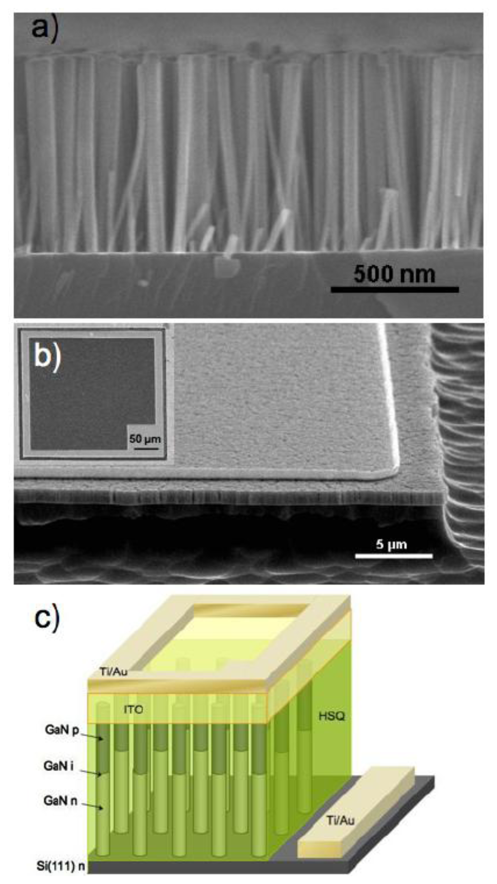 GaN nanostructured p-n junctions have been achieved in nanorods and nanowires. Son et al. reported single GaN nanorod p-n junctions which were grown by using the plasma-assisted molecular beam epitaxy (MBE) [112]. In order to form the p-n junction at the middle of the nanorod, the dopant was changed from Si (n-type) to Mg (p-type) during the growth procedure. The rectifying behavior was observed for the single GaN nanorod p-n junction under the dark condition. When the UV-light at 365 nm was applied, the photocurrent increased. The photoresponse on/off ratio was estimated to be about 14 at −0.03 V. The visible-blind photodetector based on p-i-n junction GaN nanowire ensembles were achieved by Bugallo et al. [113]. The nanowires were grown by plasma-assisted MBE on an n-type Si substrate. Figure 16 shows a cross-sectional SEM image of the as-grown nanowires, and the schematic representation of a photodetector device. The detector presented a high peak responsivity of 0.47 A/W at −1V, which was higher than that of the thin film GaN p-i-n photodetectors. The spectral response of the detector was restricted to the UV range with a UV-to-visible rejection ratio of more than 102. The photodetector response was linear over two decades of incident power density up to 6 × 10−4Wcm−2.