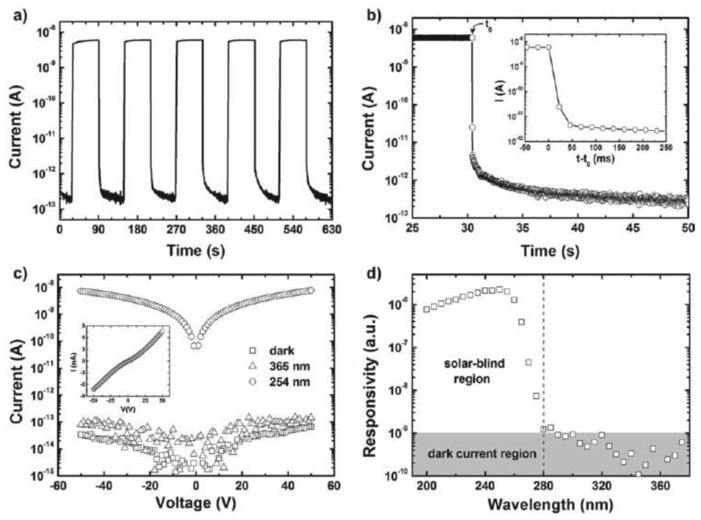 Photodetection in the ultraviolet (UV) region has drawn extensive attention owing to its various applications in industry, instrument, and our daily life. UV light is typically divided into four spectral regions: UV-A (for wavelengths between 400 and 320 nm), UV-B (for wavelengths between 320 and 280 nm), UV-C (for wavelengths between 280 and 200 nm), and far UV (for wavelength between 200 and 10 nm, which reaches the X-ray spectral low energy frontier) [1–3]. Most of the UV light from the Sun is absorbed by the atmospheric ozone layer. Solar radiation with wavelength longers than 280 nm can penetrate the atmosphere and reach the Earth. For this reason, UV detectors that have high sensitivity to UV-C and far UV radiation compared to radiation with wavelength longer than 280 nm can be called ‘solar-blind’. As visible light covers the range of wavelengths from 400 to 700 nm, UV detectors that have high sensitivity to UV-A, UV-B, UV-C and far UV radiation compared to radiation with wavelengths longer than 400 nm are called ‘visible-blind’. The detection of UV radiation presents a wide range of applications, such as chemical, environmental and biological analysis or monitoring, flame and radiation detection, astronomical studies, and optical communications. A high-performance photodetector should satisfy the 5S requirements of high sensitivity, high signal-to-noise ratio, high spectral selectivity, high speed, and high stability [4]. In some cases such as the flame detection for a hot engine, high performance thermally stable detectors are required.