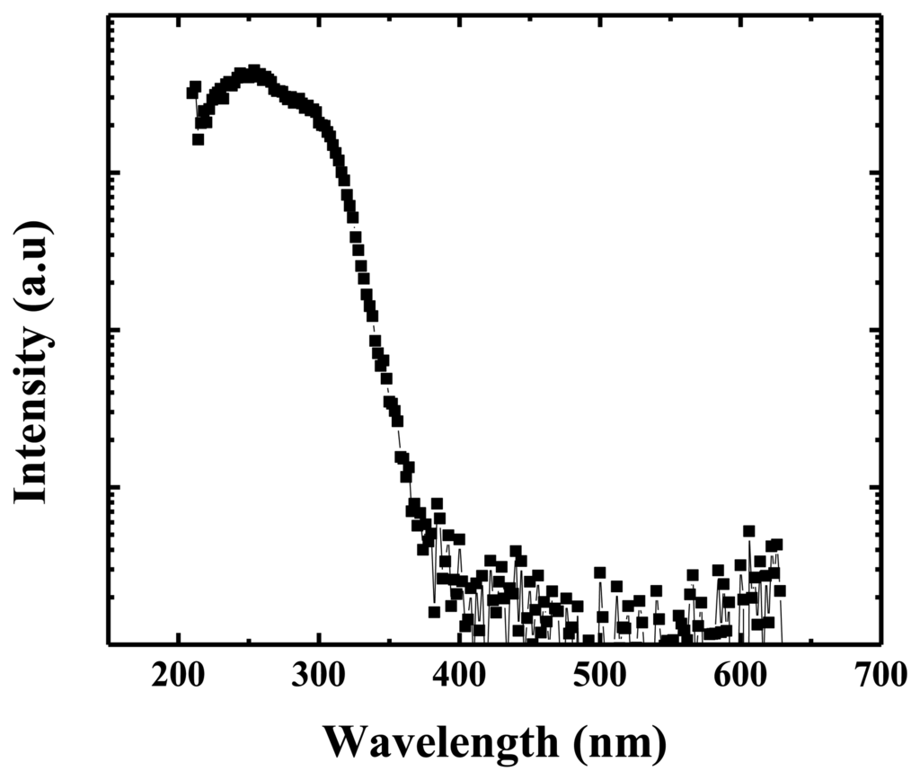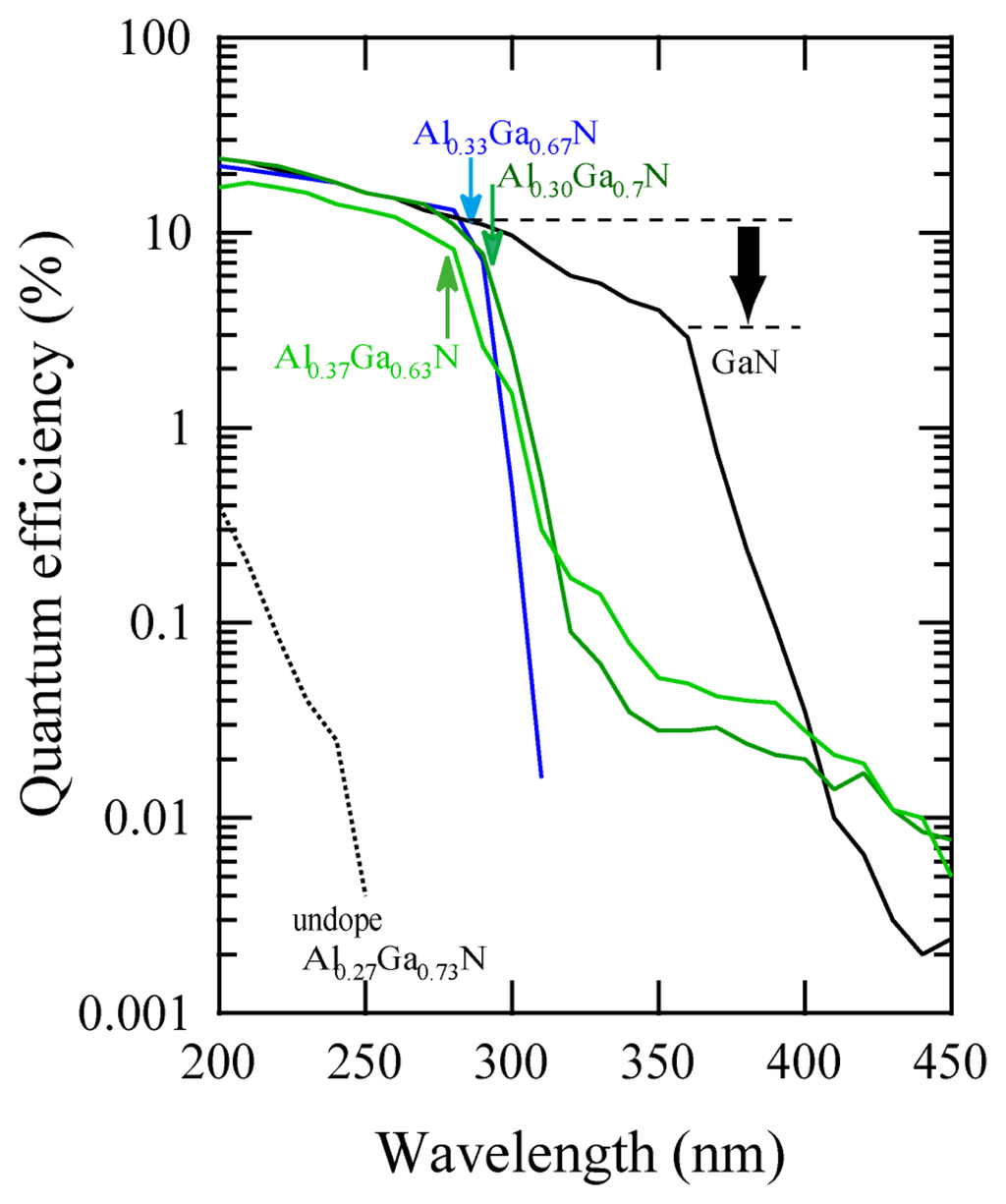 Figure 8 shows the wavelength-dependence of QE for photocathode devices using AlxGa1-xN active layers. The EQE of an undoped AlGaN photocathode was quite low (0.4%) at 200 nm, and dropped dramatically at longer wavelengths due to the potential barrier of n-type semiconductor caused by upward band bending at the surface. On the other hand, Mg-doped samples show approximately 20% EQE at 200 nm, and their QE values decreased rapidly for light-irradiation longer than the threshold wavelength. The threshold wavelengths shifted to shorter wavelength with increasing AlN mole-fraction. For an Al0.33Ga0.67N sample, the value of QE was as high as 20% at 200 nm and 15% at 280 nm, and the on-off ratio between 280 nm and longer wavelengths was more than four orders of magnitude, which was high enough for solar blind sensitivity. The valence band maxima (VBM) at the surface for p-Al0.37Ga0.63N were evaluated at 2.1 eV below the Fermi level, and the surface was bended downward by 0.3 eV [67]. The surface band profile must be formed as illustrated in Figure 7b, taken the values of both electron affinity of 3.0 eV for Al0.37Ga0.63N, and the dipole momentof ∼2.8eV induced by Cs-O adsorption into account [65–70]. Smaller barrier is still formed instead of the Cs-O dipole moment. This is the reason why the EQE decreases for the photon energy close to the band gap. Surface treatments on the active layer are well known to be crucial for the case of GaAs photocathode. Further optimization of AlxGa1-xN surface is necessary to enhance the Cs-O dipole effect, which will result in keeping the QE higher for all ranges of photo energy up to band gap.