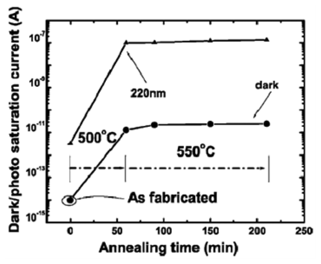 The superior physical and chemical stability of single-crystalline diamond film favor its use as a high-temperature deep UV photodetector. We have developed a thermally stable photodiode using tungsten carbide (WC) Schottky and Ti/WC ohmic contacts for a boron-doped homoepitaxial p-diamond epilayer [6]. The effect of thermal annealing in an argon atmosphere on the electrical and photoresponse properties was investigated (Figure 19). Annealing at temperatures up to 550 °C improved the rectifying I-V characteristics, resulting in a dramatic enhancement of deep UV responsivity at 220 nm by a factor of 4,000. A blind ratio as large as 105 between UV and visible light was achieved at a reverse bias as small as 1 V. The development of thermally stable WC-based Schottky and Ohmic contacts provides a route for stable operation of a diamond photodetector at high temperatures.