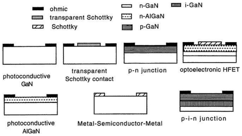 The study of photoconductive properties of GaN was started by Pankove and Berkeyheiser in 1974 [18]. With the breakthrough of the epitaxy technique for GaN film by metal-organic chemical vapor deposition (MOCVD) in the 1990s, the first GaN-based UV photoconductor was developed by Khan et al. in 1992 [19]. Since then, various teams have been exploring and developing different types of photodetector structures, such as photoconductor, metal-semiconductor-metal (MSM), Schottky barrier, metal-insulator-semiconductor (MIS), p-n junction, and p-i-n junction (Figure 1). The first stage focused on the development of high responsivity, high speed, true visible-blind using GaN and solar-blind with AlGaN (high Al mole fractions) photodetectors, which are strongly related with the film epitaxy techniques. A second stage was committed to develop the real applications such as focal-plane arrays solar-blind photodetection. These devices have been introduced and summarized by numerous review papers and book chapters [2,4,7,20]. Thus, in this paper, we limit our discussion to the state-of-the-art of III-nitride (In,Ga)N-based visible-blind and (Al,Ga)N-based solar-blind photodetectors. In addition, a special focus on the high-temperature stability of nitride-based detectors will be included in Section 2.6.