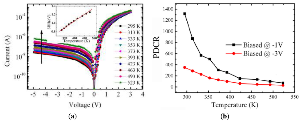 A promising strategy is the adoption of the MIS structure. We demonstrated that by using CaF2 as the insulation layer, the InGaN-based visible-blind photodiode showed the good performances at high-temperatures up to 523 K (Figure 20) [8]. The reverse leakage current remained at a low level (10−7–10−8 A), while the UV responsivity is as high as 5.6 A/W at −3 V under 523 K, without observing the PPC effect. The discrimination ratio between 378 nm UV light and visible light was maintained at more than 105. The photocurrent gain was observed at different temperatures and different voltages, which was interpreted in terms of thermionic-field emission and field-emission tunneling mechanism from RT to 463 K, while thermionic-field emission becomes the dominant mechanism at high temperatures.