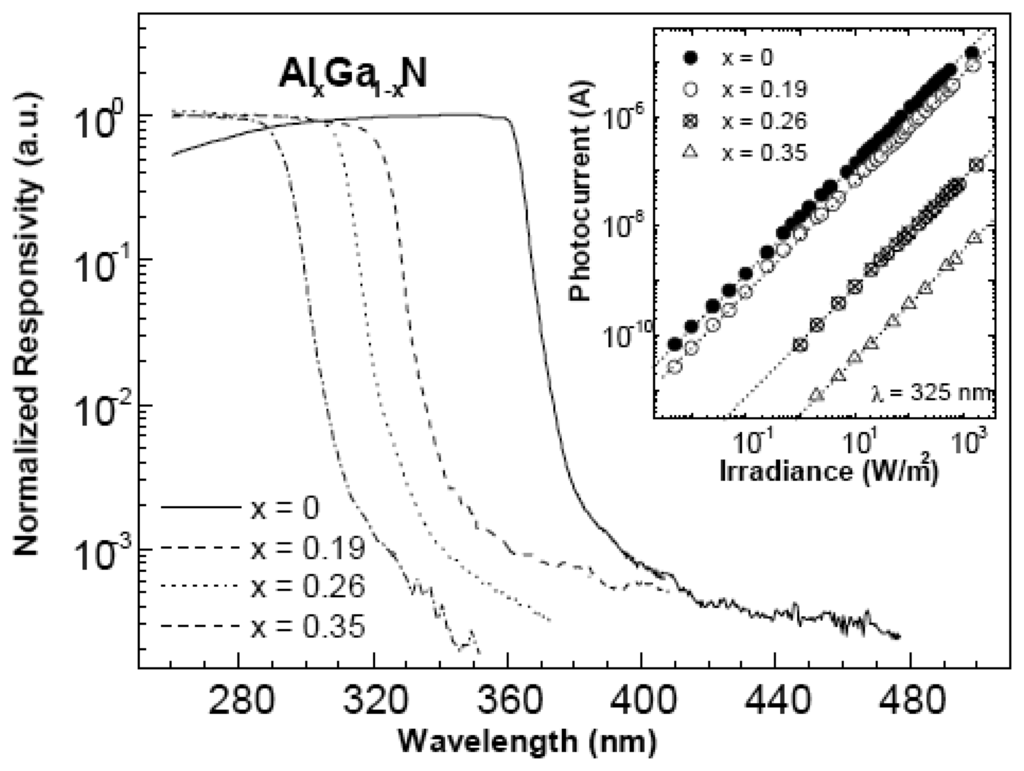 The Schottky-type photodetectors illustrate a fast response speed and little PPC effect. Metals with high work function, such as Pt, Ni, Pd or Au, are commonly used for the Schottky contact on AlGaN. To obtain the sufficient optical absorption, the metals should be thin enough for transmittance. The Schottky barrier GaN photodetectors were first reported by Khan et al., who demonstrated a Ti Schottky diode on p-type GaN, with a UV/visible ratio of more than two orders of magnitude [41]. Chen et al. reported a 50 Å Pd Schottky barrier detector on n-GaN, with a responsivity of 180 mA/W, and resistance-capacitance (RC)-limited constant of 118 ns [42]. The first AlGaN-based photodiode using 50 Å Pd Schottky barriers with an Al content of 26% was reported by the same group. It showed a responsivity of 70 mA/W and a minimum time constant of 1.6 μs [43]. An enhancement of the Schottky barrier height is observed as Al composition increased, which is resulted from the decrease in the electron affinity of the semiconductors [44]. Figure 3 shows the spectral responsivity of AlGaN Schottky diodes with different Al contents.