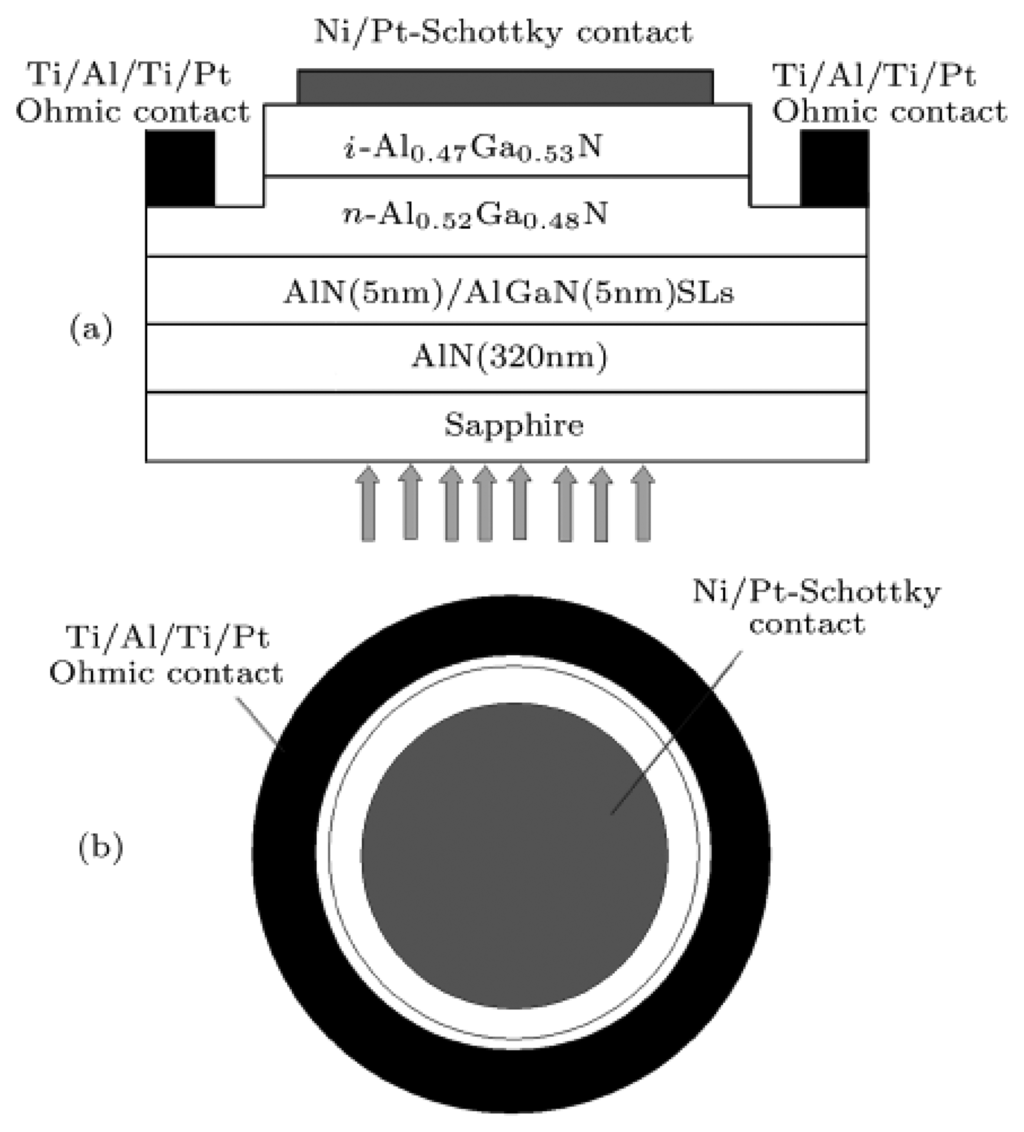 The cutoff wavelength is decreasing from 362 to 293 nm by increasing Al composition. The UV/visible discrimination ratio is more than three orders of magnitude. The absolute responsivity is decreased with Al content increasing, which is 54, 45, 30, and 10 mA/W for x = 0, 0.19, 0.26, and 0.35, respectively. To obtain the sufficient optical absorption, the metals should be thin enough for transmittance. However, the best transmittance for the reported metal Au or Ni/Au bilayers still has a light loss of ∼30% in the 350–50 nm spectral range [45,46]. Moreover, thin metal films are usually not uniform, and lead to a high leakage current. The external quantum efficiency (EQE) is also reduced by the semi-transparent Schottky contact. Back-illuminated Schottky barrier photodetectors can overcome these drawbacks. To avoid the absorption from GaN template, the back-illuminated AlGaN-based Schottky photodetectors were usually deposited on sapphire or AlN template. Figure 4 shows the structure of the Schottky-type back-illuminated photodetectors, and the contact configuration [47]. The cutoff wavelength is from 280 to 292 nm with different Al composition without bias. The devices all displayed a low dark current, a high breakdown voltage more than 40 V, and a specific detectivity of more than 3.3 × 1012 cmHz1/2W−1.