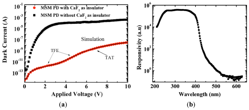 - Xie, F.; Lu, H.; Chen, D.J.; Ji, X.L.; Yan, F.; Zhang, R.; Zheng, Y.D.; Li, L.; Zhou, J.J. Ultra-low dark current AlGaN-based solar-blind metal-semiconductor-metal photodetectors for high-temperature applications. IEEE Sens. J. 2012, 12, 2086–2090. [Google Scholar]