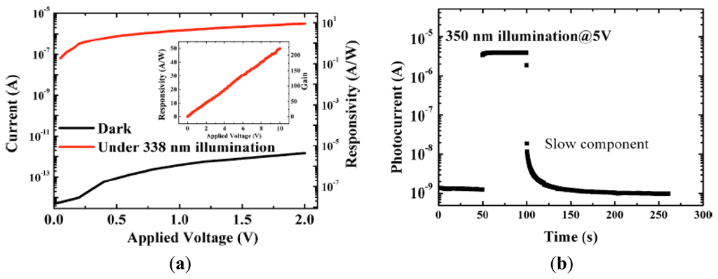 We proposed to use calcium fluoride (CaF2) with a super-wide bandgap (12 eV) as the insulation layer between the Schottky contact and a high-quality InGaN film in the MSM structured photodetectors [64]. Compared with the normally used SiO2 insulator, besides a wider bandgap, CaF2 exhibits a larger effective mass of carriers, a high electric strength, high thermal conductivity, and radiation robustness. By using 5 nm-thick CaF2 insulator, the dark current is drastically reduced by six orders of magnitude compared with those without CaF2, resulting in an extremely high discrimination ratio larger than 106 between UV and visible light, as shown in Figure 5. The responsivity at 338 nm is as high as 10.4 A/W biased at 2 V, corresponding to a photocurrent gain of around 40 (Figure 6a). The CaF2 layer behaves as an excellent insulator for the InGaN-based MSM photodetectors in dark condition, while it allows the electron injection through the metal/semiconductor interface under UV illumination, contributing to the photocurrent gain without sacrificing the response time. Figure 6b reveals the scheme of the time response at the bias voltage of 5 V. As can be seen, the electrical current drops by more than two orders of magnitude within 0.3 s (limitation of the measurement system) once the UV light is mechanically turned off. A rising response time of 747 μs under the bias voltage of 0.1 V was obtained, which illustrated a little PPC effect.
