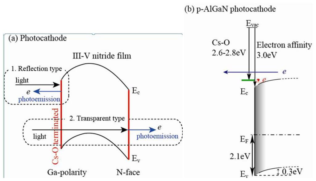 In this section, we introduce the potential of photocathode based on III-Nitride films, which has a real benefit of tunable band-gap in term of solar blindness and chemical stability. Conventionally, semiconductors with p-type conduction are used for photocathode devices. Downward band bending must be formed at the surface of p-type semiconductoras show in Figure 7a, and negative electron affinity (NEA) can be achieved by the application of adatoms onto the material surfaces due to strong dipole moments, e.g., Cs and oxygen [65,66]. There are two types of reflection- and transparence-photocathodes. Photon is emitted in the opposite direction of incident light for the former. The light penetrates through semiconductor active layer, and photon is emitted from its back surface for the latter. Seamless imaging device can be available for the transparent-type photocathode.