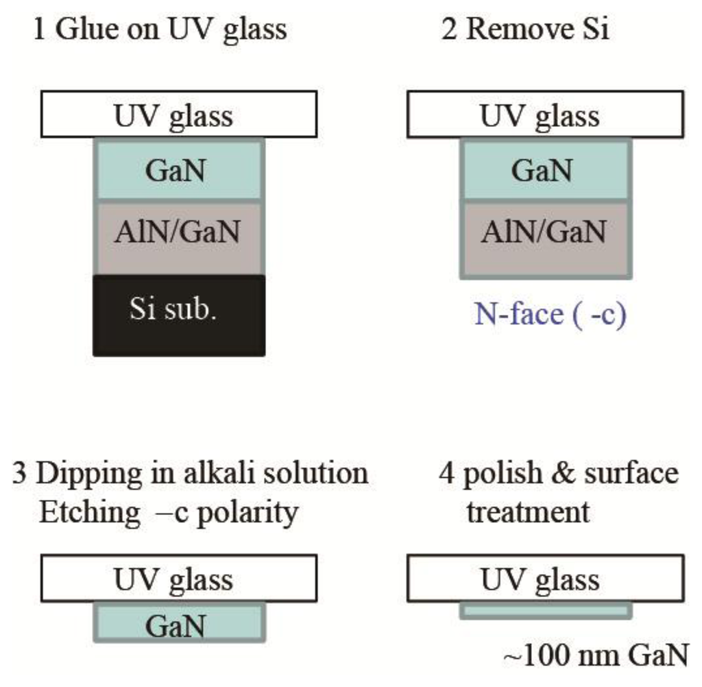 Figure 9 shows the process of transparent photocathode. III-V nitride film grown on Si substrate is glued on UV transparent plate (e.g., SiO2), and then Si substrate is removed. Since the nitride film grows along Ga-face (+c) polarity, N-face (−c) polarity surface is exposed on the SiO2. III-V nitride film with −c polarity is easily etched in alkali solution [71]. III-V nitride film is thinned down to ∼0.1 μm for sufficient light to reach the surface of the active layer without being absorbed. Since −c polar surface is negatively charged, the surface band bending must be enhanced as shown in Figure 7a, which is another advantage of III-V nitride. As shown in Figure 8, the EQE for GaN photocathode was drastically degraded down to 3%. However, after optimization of the surface treatment, the transparent photocathode with high QE (∼40%) at the band gap energy has been developed, which is available as an imaging intensifier.