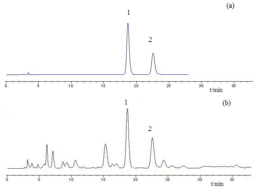 Figure 1 shows the original absorbance spectra and preprocessed spectra of 114 Chinese propolis samples. It was noticed that all spectra had similar profiles that were quite even throughout the whole wavelength range. The main difference of spectra was the different magnitudes of the spectral reflectance as shown in Figure 1, which might be caused by different contents of the internal attributes for the samples, including galangin and chrysin. The reference values of chrysin and galangin in Chinese propolis samples determined by HPLC are shown in Table 1. HPLC chromatograms of a typical propolis samples and standard solution are shown in Figure 2.