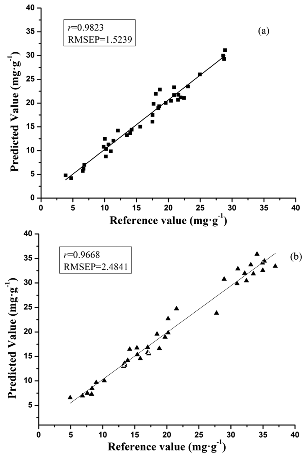 In this study, EWs were selected in order to reduce the input variables and improve the speed of model calibration. Successive projection algorithm (SPA) was used to identify EWs from the whole spectral range, where a variable group that contains a minimum of redundant information in the spectral matrix is chosen to minimize the colinearity of different variables, so that the input variables were simplified and the efficiency of modeling could be improved. SPA was performed by Matlab 7.10.0 software (The Mathworks, Inc., Natick, MA, USA). EWs selected by SPA were employed as the inputs of PLS, BP-ANN, MLR and LS-SVM to develop calibration models, and their performances were compared. The correlation coefficient (r) and root mean square error of prediction (RMSEP) were applied to evaluate the performances of the established models. PLS and MLR were implemented by Unscrambler X10.1, and LS-SVM and BP-ANN were compiled by the Matlab 7.10.0 software.