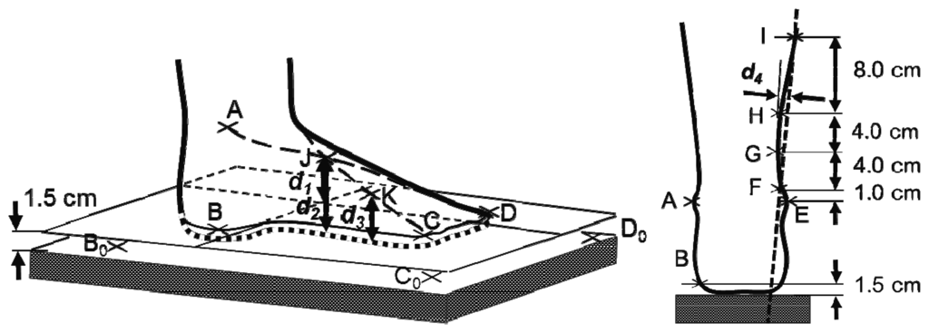 Similarly, d2 was calculated, again using point J, but with the surface of the scales as a reference (Equation (2)). d2 was expected to benefit from a more reliable definition of the reference surface, while it might be more sensitive to changes of the positioning of the foot (e.g., tilting):
