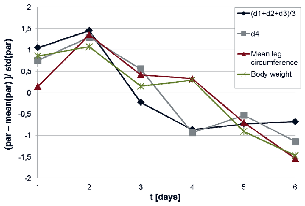 For all patients, changes of parameters d1−d5 were correlated with changes of body weight and leg circumference. Results are shown in Table 3.