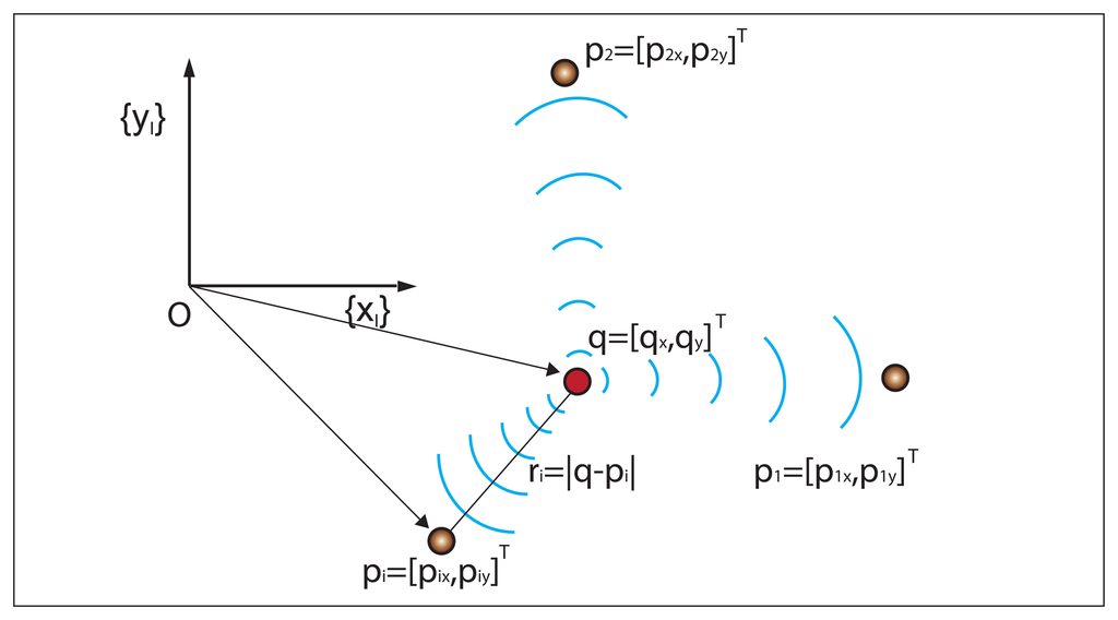 Let {I} be an inertial reference frame with unit axis, {xI}, {yI}, and let q = [qx, qy]T be the position of a target to be positioned in {I}. Further denote by pi = [pix, piy]T; i = 1, 2,.., n the position of the i – th ranging sensor, also in {I}. Let ri(q) = |q – pi| (abbreviated ri) be the distance (range) between the target, q, and the i – th sensor, where | · | denotes the Euclidean norm. The variables and the set-up that will be used are illustrated in Figure 1 for the case of one target and three sensors.