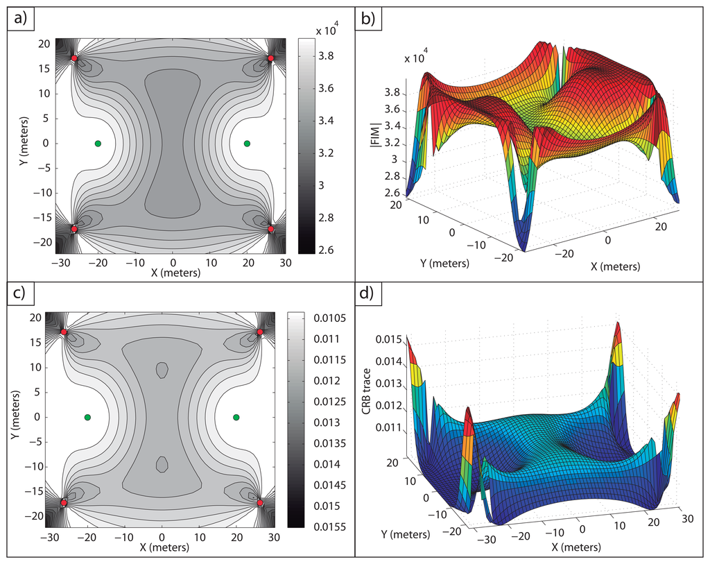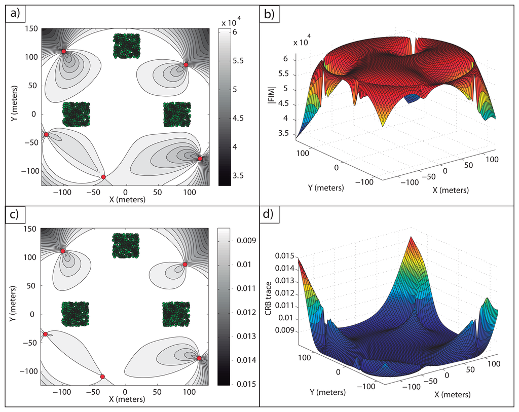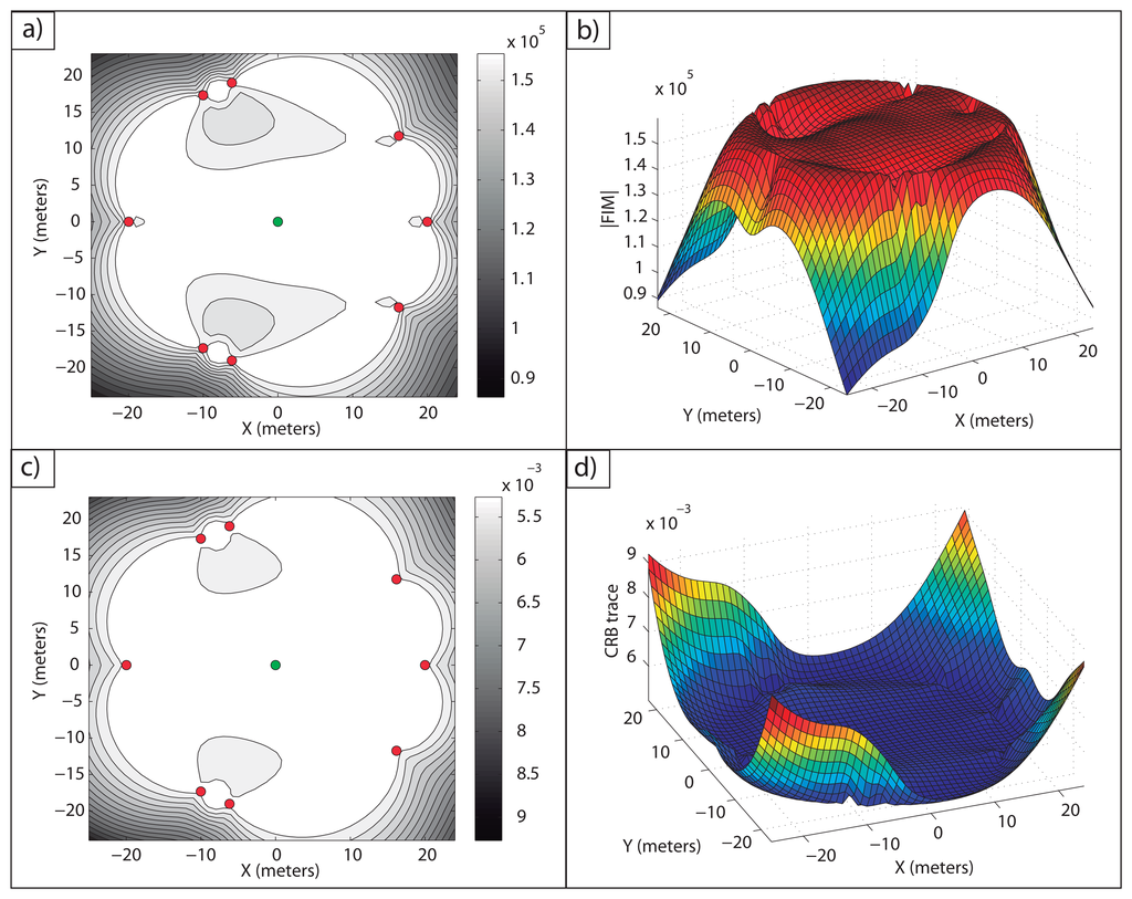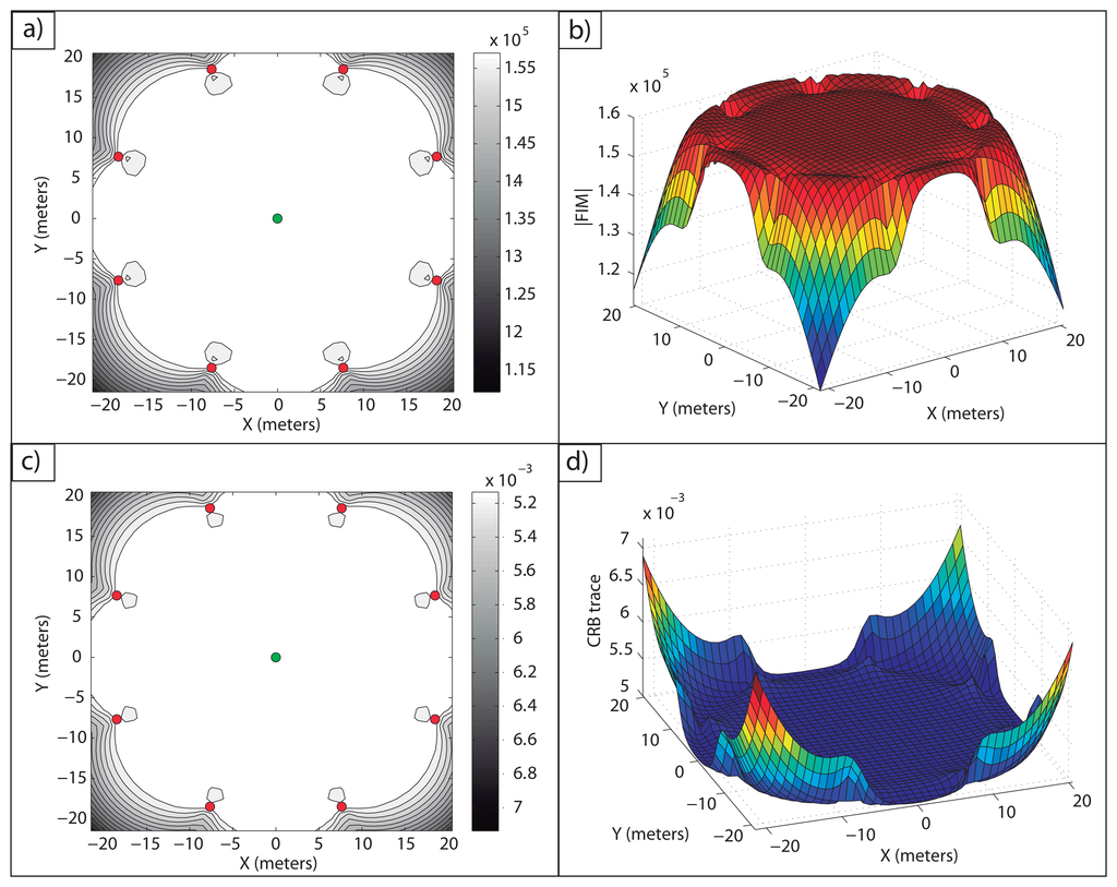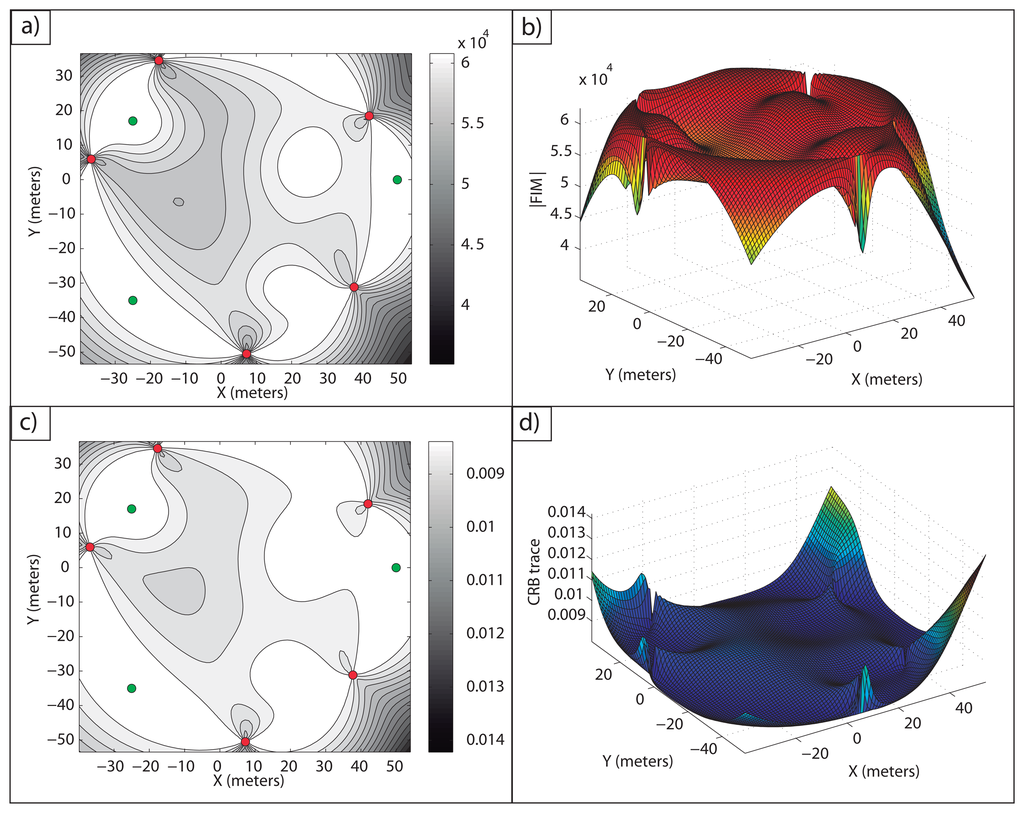 In Figure 6a,b, it is shown how the maximum FIM determinants are obtained at the targets positions and, in Figure 6c,d, how the same occurs with the minimum CRB trace.