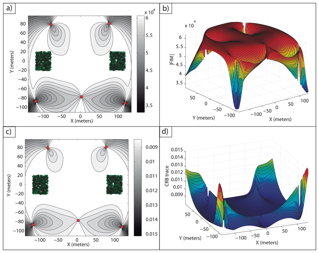 Clearly, in order for the information about the optimal configurations to be useful, one must check if the logarithm of the determinant of the FIM meets desired specifications. To this effect, and for comparison purposes, the determinant of the FIM obtained for a number of hypothetical target points (based on a fixed optimal sensor configuration corresponding to a well-defined scenario) will, at times, be computed by allowing these points to be on a grid in a finite spatial region,