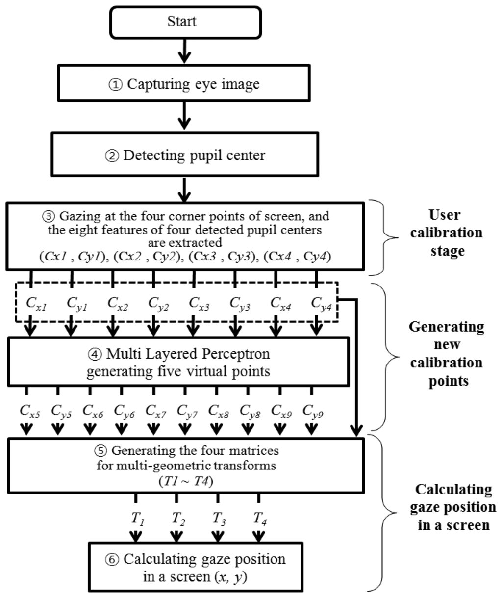 Figure 1 provides an overview of the proposed gaze-tracking method. First, a user's eye image is captured with a camera using the NIR illuminator in the device, as shown in Figure 2. The image is not affected by external visible light, because an IR-passing filter attached to the camera rejects visible light [10,11]. Second, the captured NIR eye image is processed, and the pupil center is detected (Section 2.3). Third, the user is required to gaze at points near the four corners of the screen during the user-calibration stage. The eight feature values of the four detected pupil centers are then extracted. (Section 2.4). Fourth, the eight extracted values are used as the inputs for training the multilayer perceptron (MLP). The MLP has a linear kernel, and it generates five additional points or virtual pupil centers as outputs (Section 2.5). Finally, the five generated points (virtual pupil centers) and the four actual points (detected pupil centers) are used to calculate the final gaze position (x, y) on a screen, based on multi-geometric transforms (Section 2.6).