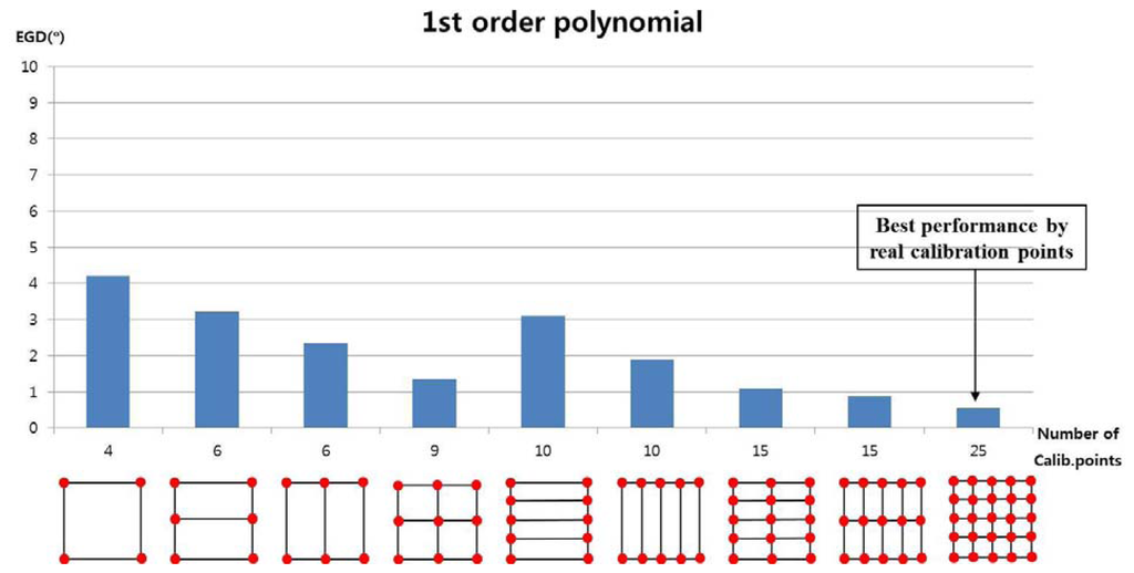 We measured the EGD with increasing number of calibration points. In the first test, we used the 1st-order polynomial mapping function (geometric transform) in Equations (5) and (7). Figure 10 shows the performance with 4, 6, 9, 10, 15, and 25 calibration points. We applied geometric transform matrices to each subarea to map the pupil movable area onto the screen area. For example, when the number of calibration points was 9, a user actually gazed at nine calibration points. Four geometric transform matrices (T1, T2, T3, and T4 in Figure 8) were used to calculate the gaze position in each sub-region. As shown in Figure 10, the EGD generally decreased as the number of calibration points increased, if the calibration points included the screen center. The EGD was lowest when a user gazed at 25 calibration points.