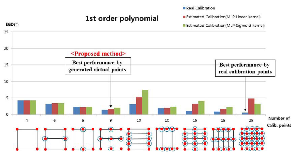 The EGD values for Figure 13 are shown in Table 3. With the proposed method (MLP with a linear kernel), the EGD was lowest (1.75°) in the scenario where the user actually gazed at four points and five additional virtual points were generated, compared to other scenarios. The EGD was lowest when a user actually gazed at 15 calibration points (0.78°); however, the proposed method is much more convenient for the user, because they had to gaze at only four positions during the initial calibration stage. The lowest EGD of the 2nd-order polynomial function (1.75°) was higher than the lowest EGD of the 1st-order polynomial function (1.66°), as shown in Table 2. Thus, we confirmed that the accuracy was better when using the 1st-order polynomial function.