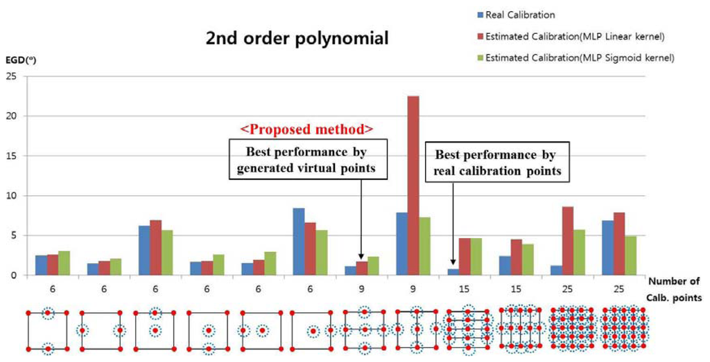 In the next experiment, we measured the EGD when using the proposed method with the 2nd-order polynomial function to generate the virtual points, as shown in Figure 13. For example, with nine calibration points, each user actually gazed at four calibration points (the four corners of the screen, i.e., the uncircled red points), and the virtual points (the red points inside the blue dotted circles) were generated with the MLP algorithm, which used linear or sigmoid kernel functions. In Figure 13, “real calibration” refers to Figure 12, where the user actually gazed at all of the calibration points without generating virtual points.