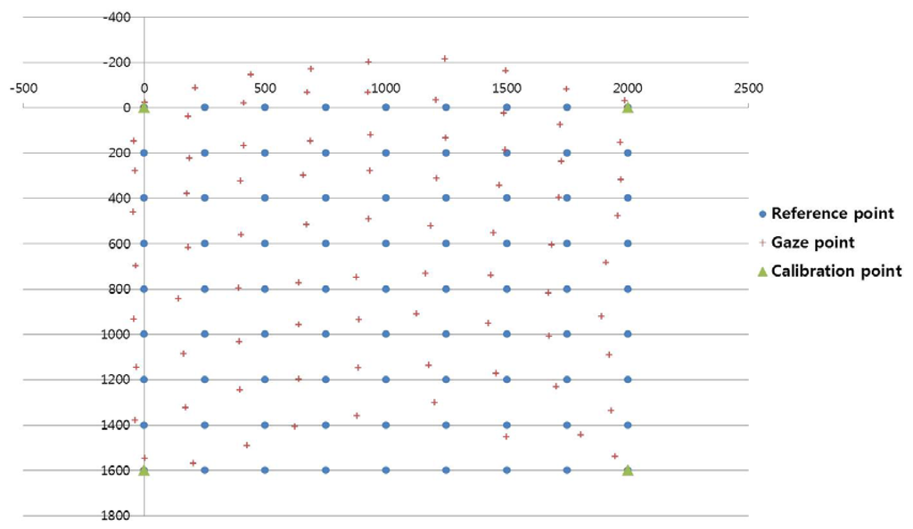Figure 14, Figure 15, and Figure 16 show examples of the experiment results. In Figure 14, the user gazed at four calibration points, and the gaze position was calculated using the existing geometric method without generating virtual points [11]. Figure 15 shows the results using the proposed method with the lowest EGD in Table 2. The same user gazed at the four calibration points, and five virtual points were generated using MLP with a linear kernel. The gaze position was calculated based on the 1st-order polynomial function. Figure 16 shows the results with the “real calibration” method using the lowest EGD in Table 2. The same user gazed at nine calibration points, and the gaze position was calculated using the multi-geometric transform method.