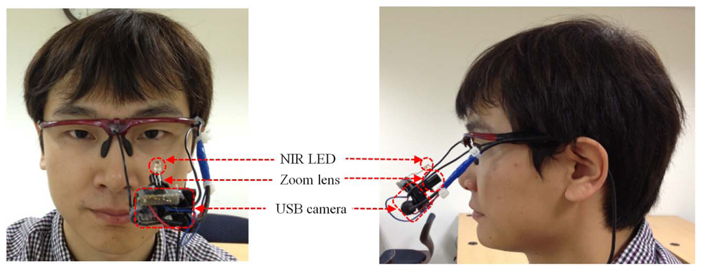 In this study, we developed a gaze-tracking method that uses a wearable-type device. As shown in Figure 2, the device is comprised of a small universal serial bus (USB) camera and an NIR LED (light emitting diode) [10,11]. The USB camera is a Logitech WebCam C600 [27]. The NIR-passing (visible light rejection) filter is included in the camera, and an additional zoom lens is attached to the camera's built-in lens [10,11]. Thus, the camera can capture the magnified NIR eye image unaffected by external visible light. The Z distance between the camera lens and the eye is about 8 cm. The detailed specifications are as follows: