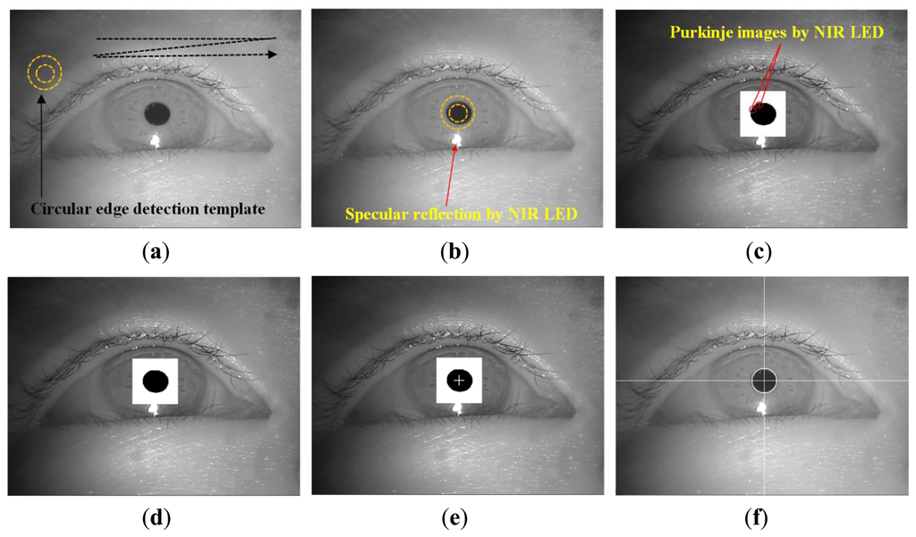 In Step 2 of Figure 1, The circular edge detection (CED), local binarization, morphological closing, and geometric center calculation are performed sequentially to detect the pupil region in the NIR eye image, as shown in Figure 3 [6,10,11,28]. First, two scalable concentric circles (external and internal circles) are moved together within the whole image, as shown Figure 3a. The pupil center is determined to be the position where the average of sum of pixel difference between the outer circle and the inner circle is maximized, as shown in Figure 3b. The detected pupil region is used to define a rectangular region on which local binarization is performed, as shown in Figure 3c. The threshold value for the local binarization is determined using the p-tile method [29]. The NIR LED used in our device (Figure 2) generates two types of reflections: specular reflections and Purkinje images. As shown in Figure 3b, specular reflections are produced on the corneal surface and are referred to as the first Purkinje image [11]. The specular reflections are not included in the pupil area because of the relative positions of the NIR LED and the user's eye, as shown in Figures 3b and c; hence, they are not used to detect the pupil center in our study.