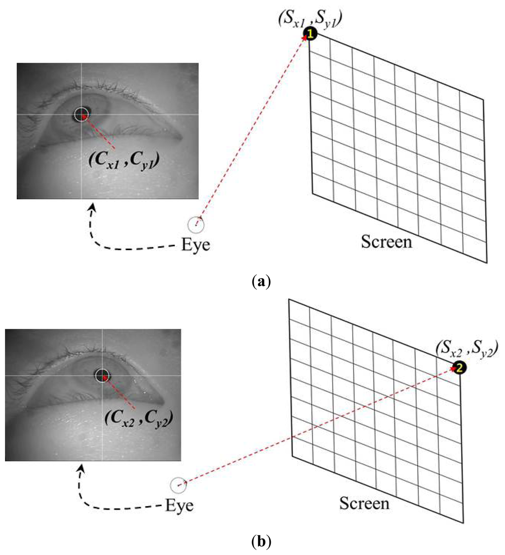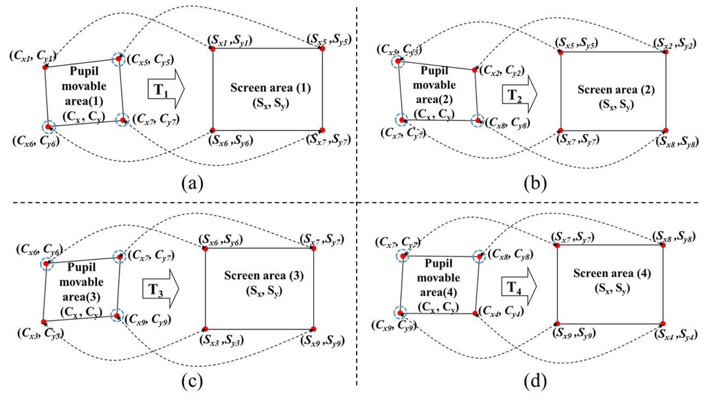 As shown in Figure 8a, T1 is the mapping transform matrix between Pupil Movable Area 1 and Screen Area 1. Using the training data, T1 can be obtained in advance by multiplying S1′ and the inverse matrix of C1′ in Equation (9) [10,11].