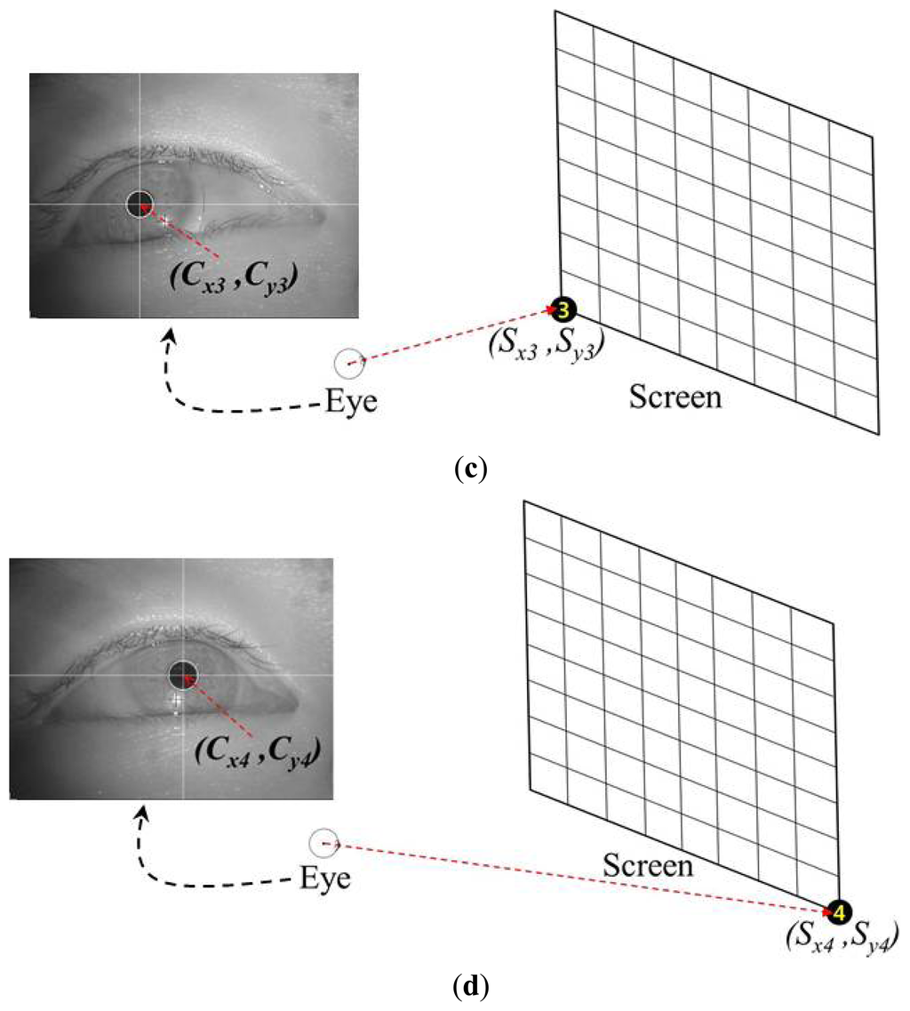 Most conventional gaze-tracking systems require an initial user-dependent calibration procedure. In the present study, a user is requested to gaze at the four corners of a screen, as shown in Figure 4. When the user gazes at the four reference points, the four center positions of the user's pupil [(Cx1, Cy1), (Cx2, Cy2), (Cx3, Cy3), and (Cx4, Cy4)] are obtained. Figure 4a–d show the four eye images and the pupil center positions when a user gazes at the top-left, top-right, bottom-left, and bottom-right reference points, respectively. These eight values [(Cx1, Cy1), (Cx2, Cy2), (Cx3, Cy3), and (Cx4, Cy4)] are used in the next step to estimate the five virtual points using the MLP algorithm.