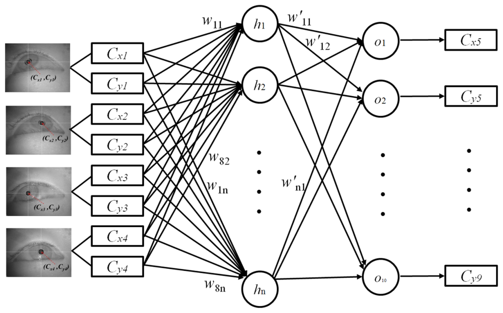 As explained in Section 2.4, the four center positions of the user's pupil [(Cx1, Cy1), (Cx2, Cy2), (Cx3, Cy3), and (Cx4, Cy4)] are obtained during the user-calibration stage. The eight values [(Cx1, Cy1), (Cx2, Cy2), (Cx3, Cy3), and (Cx4, Cy4)] are used as the inputs for the MLP to estimate the five virtual points of the pupil centers [(Cx5, Cy5), (Cx6, Cy6), (Cx7, Cy7), (Cx8, Cy8), and (Cx9, Cy9)], as shown in Figure 5. A back-propagation algorithm is used to train the MLP [31], which has eight input and ten output nodes.