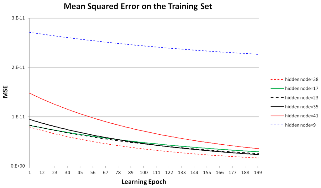 Figure 6 shows the MSE using different numbers of hidden nodes with the training data, given eight input and ten output nodes in the MLP, as shown in Figure 5. The MSE decreased as the learning epoch increased during MLP training. In this experiment, we compared the MSE on the training set according to the numbers of hidden nodes from 1–50. Based on the minimum MSE in the experiment results, we selected 38 as the optimal number of hidden nodes. To simplify the graph, Figure 6 shows only the cases where the numbers of hidden nodes are 9, 17, 23, 35, 38 (optimal), and 41.