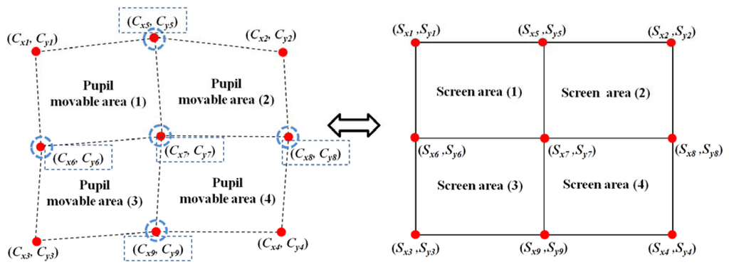As shown in Figure 7, four relationships are defined between the four pupil movable areas and the four screen areas after the user-dependent calibration stage is completed; for example, the relationship between Pupil Movable Area 1 and Screen Area 1. The pupil movable area and the screen area are a distorted quadrangle and a rectangle, respectively, as shown in Figure 7; hence, each relationship can be determined as a mapping function. In general, 1st-order or 2nd-order polynomials are used as the mapping function, as shown in Equations (5) and (6).