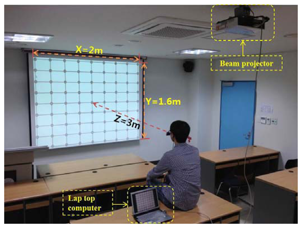 The proposed gaze-tracking method was tested on a laptop computer with an Intel Core 2 Duo 1.83 GHz CPU and 1 GB RAM. The algorithm was developed in C++ using Microsoft Foundation Class (MFC), and the image capture software was produced using the DirectX 9.0 software development kit (SDK). In our experiments, each user gazed at 81 reference points on a screen, as shown in Figure 9. The screen size was 2 m × 1.6 m (horizontal and vertical), and the distance from the user to the screen was approximately 3 m. Ten subjects participated in this experiment and each subject had six trials. Half of the data were used for training, and the other half were used for testing. This procedure was repeated by switching the training data and the testing data, and the average accuracy was calculated.