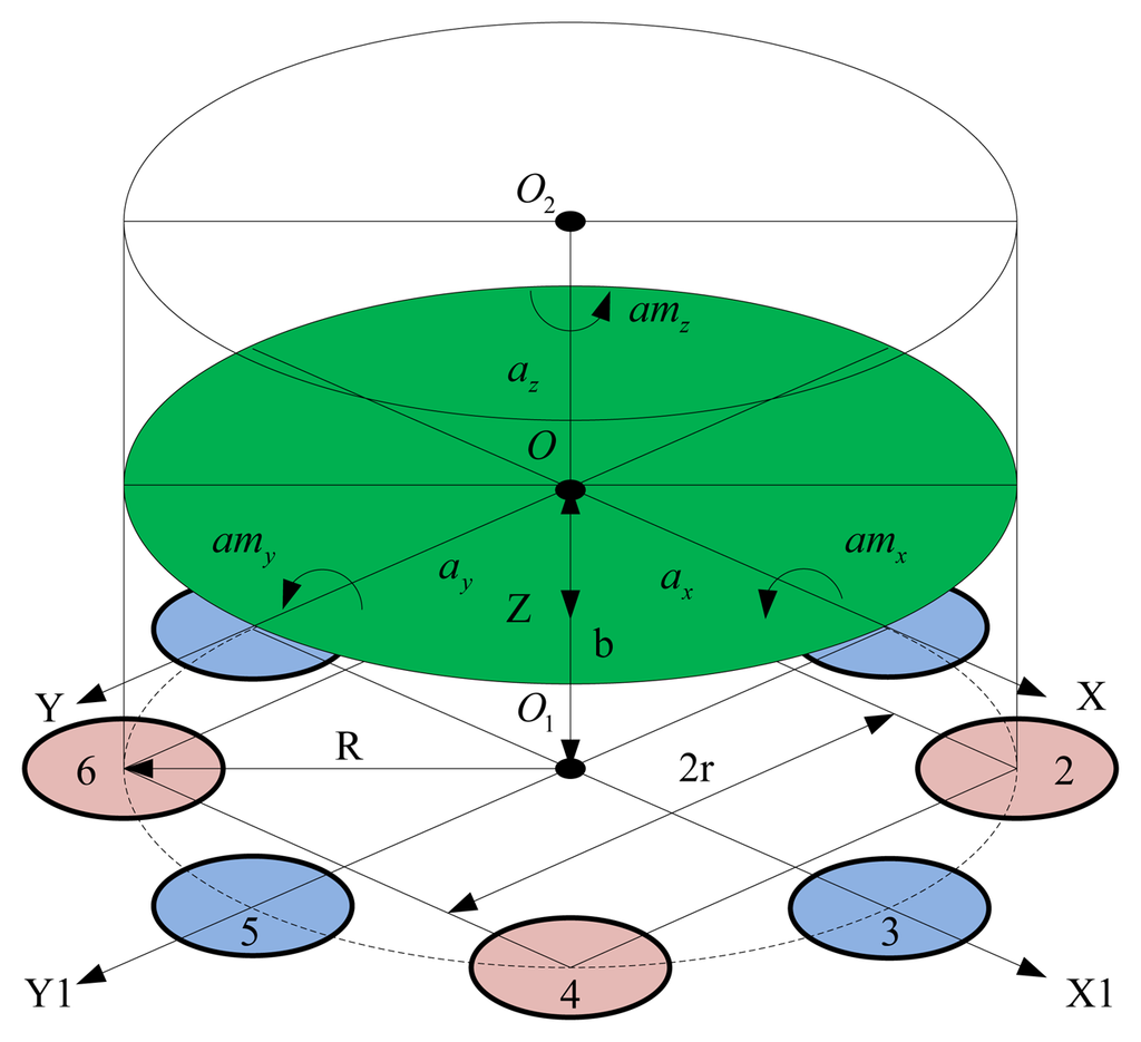 Figure 2 shows the block diagram of the piezoelectric six-axis accelerometer structure. The designation O-XYZ represents the coordinate system of centroid of inertial mass and O1-X1Y1Z1 denotes the installation layout position coordinate system of quartz crystal chip groups. The quartz crystal chip groups are arranged along the same circle with radius is R, the distance between the quartz chip group 2 and 4 is r = Rcos45°, and the distance between the centroid of inertial mass and the surface of quartz crystal chip groups is b, the inertial force that generated by acceleration acting on each quartz crystal chip groups can be expressed by Equation (2):