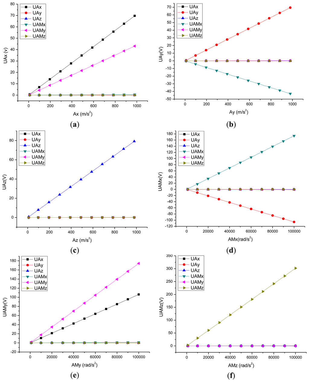 In the piezoelectric coupled field process based on the ANSYS software, the potential difference between the surface of piezoelectric quartz crystal chip can be obtained, so in the paper, the relationship between the potential difference and the acceleration was selected instead of the relationship between the acceleration input and the potential output. Figure 3 show the curves of the input acceleration and the output potential in the directions of ax, ay, az, amx, amy and amz. The symbol U represents the potential. According to these curves, it can get the six-DOF accelerometer's C matrix as shown in Equation (4):