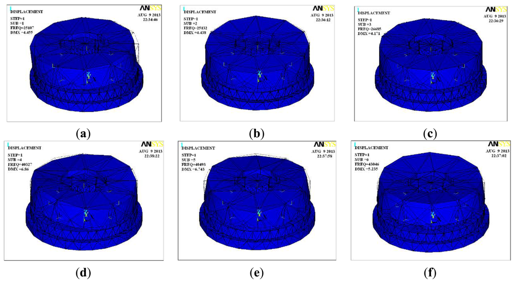 Research on the piezoelectric six-DOF accelerometer's dynamic characteristics involves the study of its natural frequency. Modal analysis, harmonic analysis and other methods based on ANSYS software can be used to estimate the natural frequency of the six-axis accelerometer. Figure 4 shows the natural frequency of first six ranks and its vibration modes for the six-DOF accelerometer, Table 3 shows the modes traits of the first six ranks. Since the structure of six-axis acceleration sensor belongs to a symmetrical structure type, the natural frequency of the inertial force in the direction X and Y, the inertial torque in the direction Z are the same, the minimum theoretical value of six-axis acceleration sensor's natural frequency can reach to 25 kHz, however, the six-DOF accelerometer's amplitude frequency characteristics of each frequency point can't be obtained with the modal analysis method.