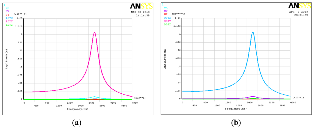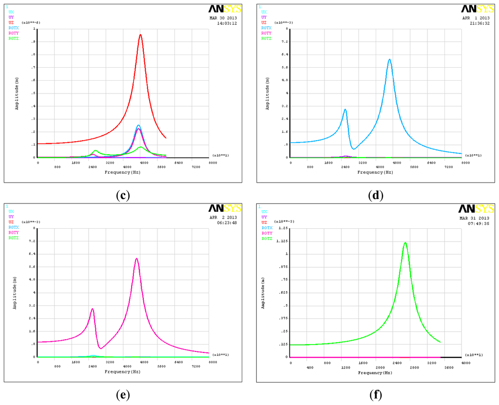 To study the amplitude frequency characteristics of the piezoelectric six-DOF accelerometer, the harmonic analysis method was chosen. Figure 5 shows the amplitude frequency characteristics curves of six-DOF accelerometer. As can be seen that the linear acceleration and the angular acceleration of the X,Y,Z directions are 26.2 kHz, 26.2 kHz, 48.0 kHz, 47.2 kHz, 46.4 kHz and 26.5 kHz, and there is a resonance point at 25.8 kHz in the angular acceleration of X and Y direction. Table 4 shows the dynamic cross coupling characteristics of the six axis acceleration sensor, which take place at the frequency point of 18.6 kHz. This frequency point is the 0.707 times lowest resonant frequency of the six-DOF accelerometer. It is different between the dynamic cross coupling and static cross coupling, there are some nonlinear components in the dynamic cross coupling characteristic, and as the test frequency declines, the dynamic cross coupling of the six DOF accelerometer will drop slowly.