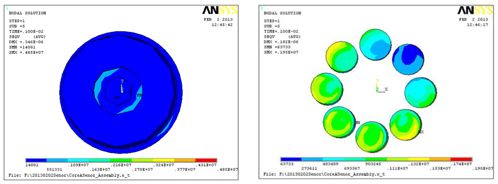 Figure 6 shows the strain cloud of the six-DOF accelerometer's core parts, Table 5 shows the input and output decoupling results, on the condition that the composite loads acted on the six-DOF accelerometer. It can be seen that these static cross coupling interferences are different from traditional nonlinear coupling and can be eliminated using a mathematical compensation method. Due to the cross coupling interferences of six-axis accelerometer take place in the ay, amx, ax, amy directions, so in these directions there are some relatively large calculation errors.