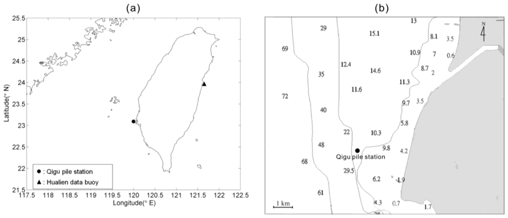 To verify the numerical accuracy of computing Equation (13), the estimated wavelet spectrum of sea surface elevations, which is derived from the wavelet spectrum of wave accelerations by means of Equation (13), should be compared to the wavelet spectrum of observational sea surface elevations. Accordingly, an in situ dataset of sea surface elevations and accelerations for the same measurement location and duration was required to conduct an inspection. However, it is quite difficult to collect sea surface elevations data from a floating platform. Although a GPS sensor could be used to obtain the sea surface displacement records, we do not have the simultaneous observational records in our study site. To address this issue, the sea surface elevation records, measured by ultrasonic wave gages on a pile station, were chosen to develop the corresponding synthetic acceleration data by means of double forward difference. The location and the surrounding bathymetry of the pile station are shown in Figure 1. A total of 1,500 time-series records of sea surface elevations, collected from the pile station, were used to assess the accuracies of the wavelet spectra and the synthetic sea surface elevation signals which are estimated from the wavelet theory. The significant wave height and the mean wave period conditions of most of the data records are 0.5–2 m and 4–6 s, respectively. These wave cases are recorded from August 2000 to January 2001. The waves during this duration are often higher because of the influences of typhoons and winter monsoon. The wave height and period were calculated based on the zero-up-crossing method [24]. The sampling rate of these records is 2 Hz. For the case in each hour, the duration of data acquisition is 10 minutes, which indicates 1,200 data points will be recorded. To apply the fast Fourier transform algorithm to our study, we selected the first 1,024 data points from each case for further analysis.