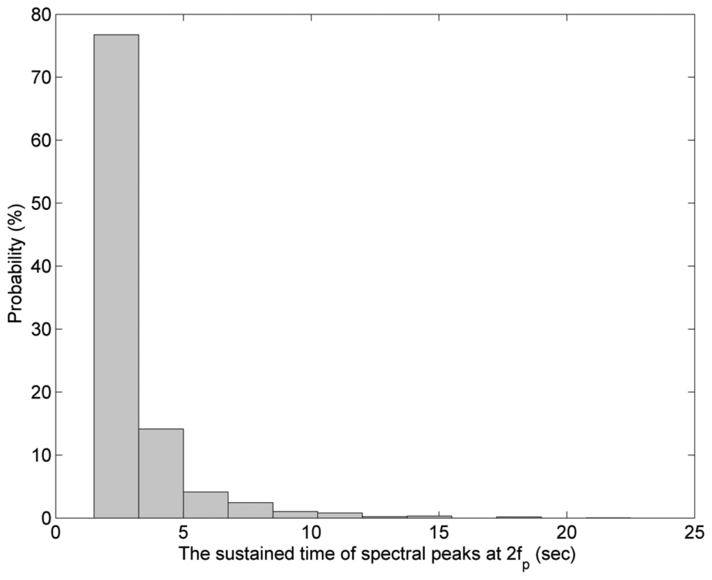 To avoid the overlap of energy density between fp and 2fp, the value of Dr was set up as 0.05 Hz in our study. Under this definition, we can observe an obvious spectral peak at 2fp from the wavelet spectrum. However, the spectral peak at 2fp is only sustained for several seconds. Figure 10 presents the probabilities of sustained time durations of the spectral peak at 2fp from the wavelet spectra of all wave records. However, the cases of duration shorter than 1 s were not included in Figure 10, because the sampling interval of wave records is 0.5 s. It shows that most of the sustained time durations are shorter than 5 s, i.e., the existences of most of harmonic spectral peaks are transient. In other words, the phenomenon of wave nonlinearity can be non-stationary. Under this situation, the wave spectrum derived by Fourier transform isn't able to present the short-time wave features. Neither is the time-averaged wavelet spectrum.