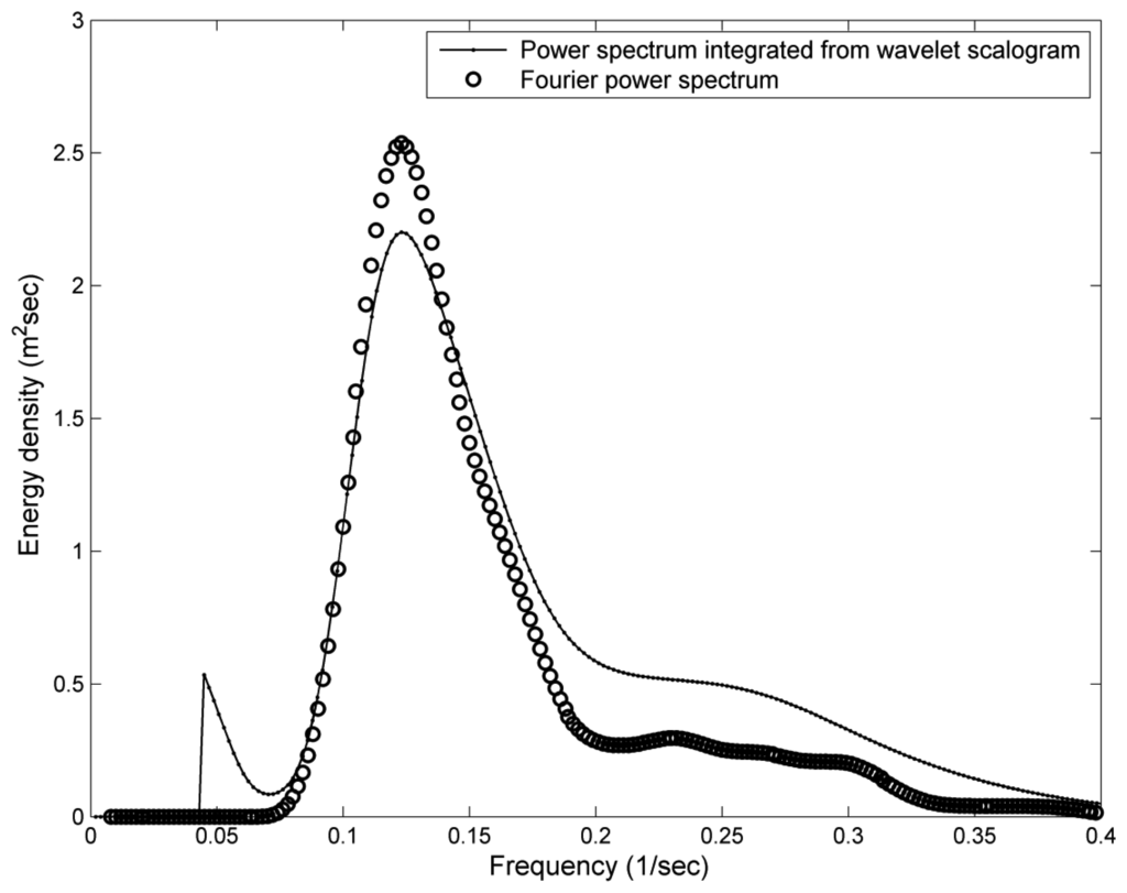 Figure 2 has shown prominent inaccuracies on estimating the wavelet spectrum of sea surface elevations at the beginning and the end of the time period considered. These inaccurate estimations occur because of the limited expansion length of the wavelet function that generates the spectral leakage. The wavelet function is not complete at the locations of interest near the marginal region of the signal because its energy distribution is cut off at the two ends of the signal. After applying this incomplete wavelet function to the wave signal, the spectral energy leaks. However, the wavelets with larger scale parameters are always used to analyse the longer waves. This finding means the spectral leakage at the two ends of the signals would be more obvious when we analyse longer waves.