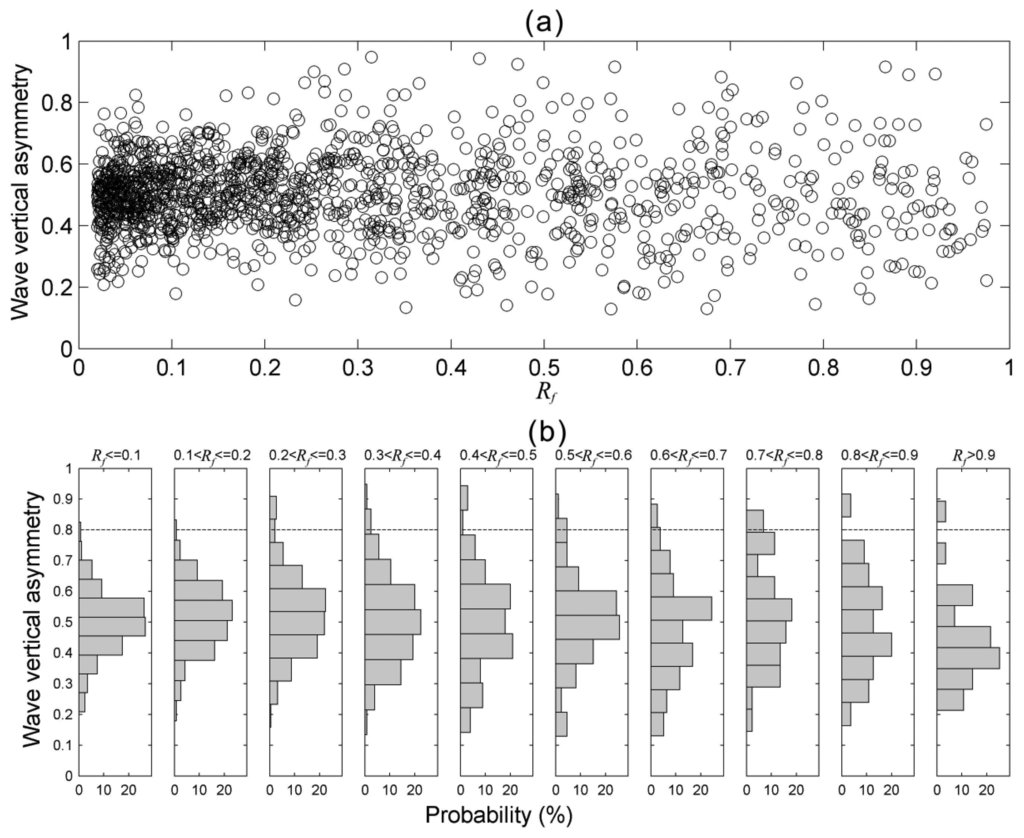 After reviewing 8,000 wavelet spectra derived from in situ acceleration signals of the wave buoy, the relationship between Rf and Va was acquired and is shown in Figure 12. It shows that most of the Va are in the range of value 0.3–0.7. However, more wave profiles with higher Va values were observed in the cases of Rf > 0.2. In some cases Va can be even larger than 0.8. Some experiments, based on regular wave cases, showed the vertical asymmetry continuously increased as the wave shoaled and reached a maximum of between 0.62 and 0.74 at breaking [35]. However, real ocean waves in Nature are always irregular, random, and even nonlinear in some situations. Although the vertical asymmetry of a wave profile with higher crest and shallower trough could be estimated by means of zero-up-crossing method, its energy interaction between frequencies is hardly to inspect because most of harmonic spectral peaks are transient as mentioned and proved in the preceding paragraph. In this study the wave cases with very high vertical asymmetry values of Va > 0.8, their Rf values was found to be larger than 0.2. This result implies that the wave instability should be related to short-time wave nonlinearity. To explore more detailed characteristics of wave nonlinearity, not only should the sea surface elevation be examined, but also its wavelet spectrum is worthy of being explored.