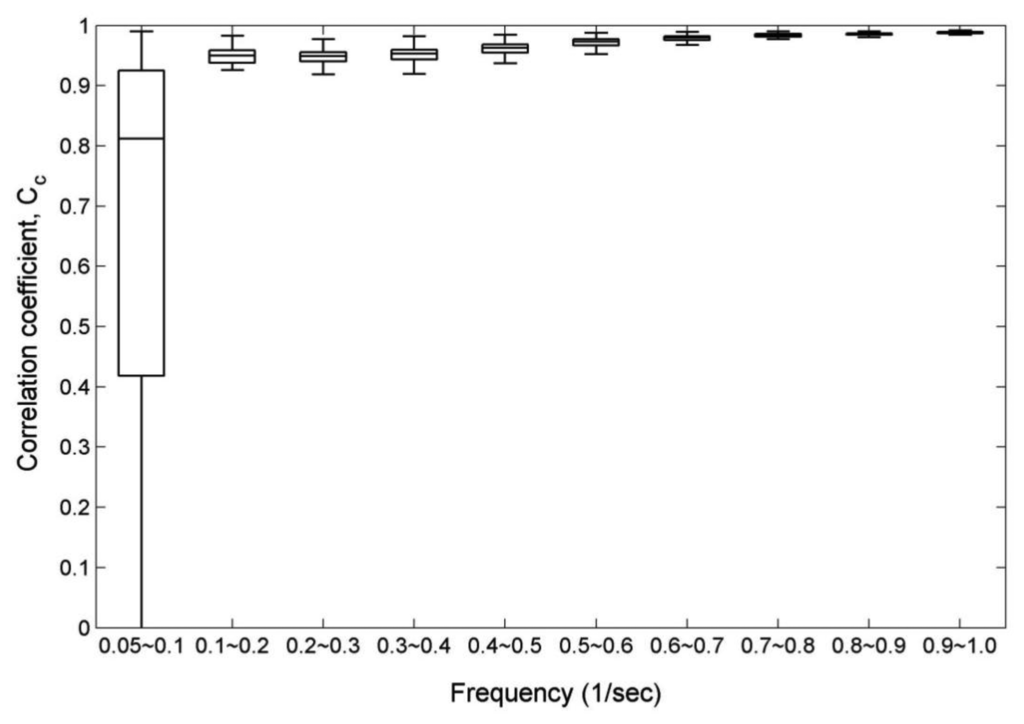 The box-whisker plot in Figure 3 was used to present the correlation coefficients of 1,500 wave data set for each frequency bin. The noises in the very-low-frequency bins are strong, but we only discuss the energy in the frequency bands that are greater than 0.05 Hz as mentioned previously. Figure 3 reveals that the correlations between the two wavelet spectra are greater in higher-frequency bins. Because of the transfer function ω−4 in Equation (13), the energy densities in lower frequency bins are substantially amplified. Especially, the correlations in the low-frequency bins of 0.05–0.1 Hz are poor and unstable although the cut-off frequency has been applied to the wavelet spectrum. We might set a higher value for the cut-off frequency, but upon doing so parts of wind-generated wave energy density could be eliminated. In addition to the noise in very-low-frequency bins, the observational acceleration signals of buoys also include some electronic noise and, as it is sampled, digitization noise. The frequency dependent noise correction function was intended to compensate for small levels of electronic and digitization noise that might appear in acceleration spectra [28,29]. However, the noises caused by the transfer function ω−4 at very-low-frequency bins are more evident than electronic noise when the wavelet spectrum is estimated by Equation (13). In a later section, we will focus on the influences of different cut-off frequency thresholds on the accuracy of the estimated wavelet spectrum.