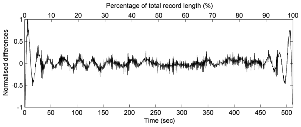 Since the estimated wavelet spectra of sea surface elevation records have be derived, the synthesized data sets of sea surface elevations can be also imitated through the inverse CWT algorithm of the estimated scalogram of the sea surface elevation record. It is necessary to measure the accuracies of synthetic sea surface elevation records. To obtain the synthetic sea surface elevations, Equation (11) was used in our study. The scale parameter a and the translation parameter b in this formula was set up based on the terms t and ω from Wη(t,ω). The Morlet wavelet function was still implemented in Equation (11). Figure 4 presents a comparison of one set of observational sea surface elevations η′(t) with its synthetic sea surface elevations η(t). The normalised differences Nd between η′(t) and η(t) is defined as: