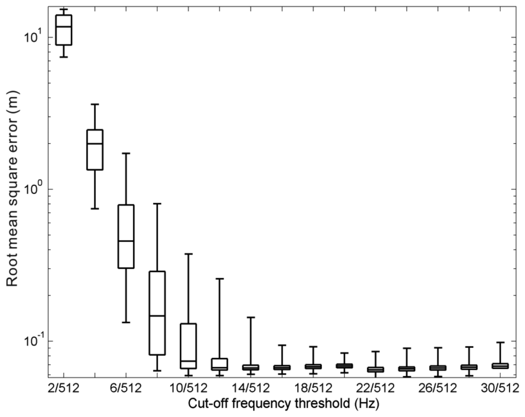 The results of this analysis indicated that to obtain an accurate estimate of the sea surface elevations from the wavelet spectrum, the cut-off frequency should not be less than 16/512 Hz. Finally 22/512 Hz was chosen as the cut-off frequency for our following treatments because its corresponding root-mean-square-error of the 75th percentile of data set is lowermost in Figure 5.