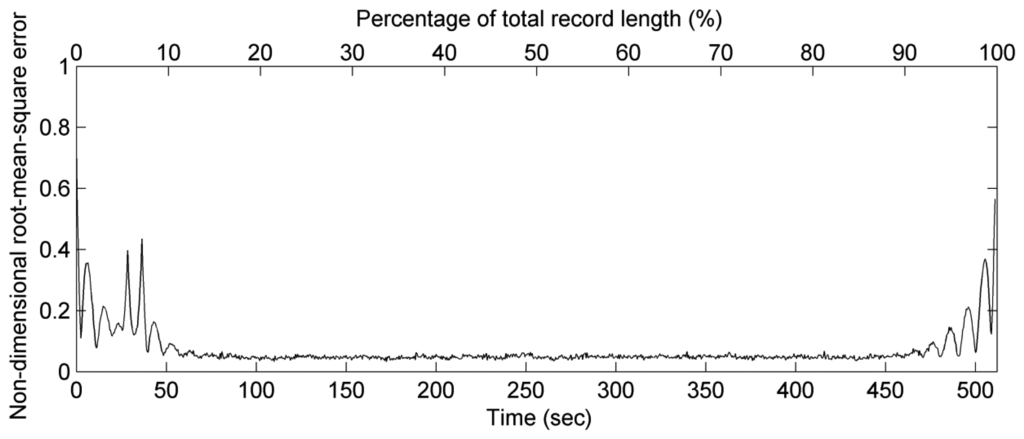 The maximum wave period of our wave datasets is approximately 10 s. The window width of wavelet functions (3σt) could then be estimated to be 72.9 s when we applied 10 s as the wave period condition to Equations (8), (10), (20) and (21). This estimated result for the window of wavelet function is quite similar to the result shown in Figure 6. It means that three times of the standard deviation is a proper threshold for the margin widths of estimated wavelet spectrum and synthetic sea elevations. Based on this result, the total marginal width is approximately 30% of the measured accelerations for a recording duration of 10 minutes in a wave buoy. A longer recording time can be used to reduce the percentage of the marginal width.