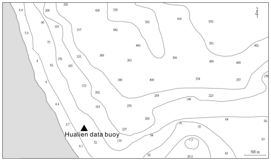 After confirming the feasibility of applying the aforementioned wavelet-based algorithm to observational wave records of a pile station, Equation (13) can now be used to synthesize sea surface elevations from the observational acceleration signals of a wave buoy. As shown in Figure 1, the data buoy of 2.5 m in diameter is located 0.4 km from the coast of eastern Taiwan (see Figure 1 for location), where the water depth is 30 m and surrounding bathymetry is shown in Figure 7. A total of 8,000 time-series records of acceleration signals were collected from the data buoy. Their significant wave heights and the mean wave periods are calculated from wave spectrum [24] and have a range of 0.5–3 m and 4–8 s, respectively. These results indicate that part of our data belongs to the cases of transitional water waves, which interact with the sea bed. Compared to the pile station, which is located inside the Taiwan Strait of finite water depth, the buoy is located in the open ocean (the Pacific). Thus, the wave heights and periods recorded from the buoy are often larger than those recorded from the pile station.