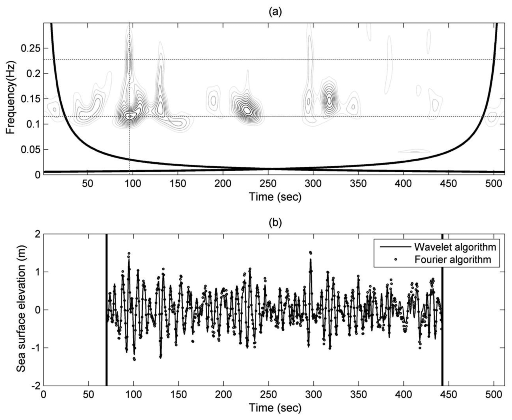 The application of the continuous wavelet transform has become increasingly common since its inception in the early 1980s. Compared to the Fourier transform which is based on the concept of frequency, the continuous wavelet transform is based on the concept of time-frequency localization. Wavelet transforms are capable of obtaining orthonormal basis expansions of signals using time-frequency atoms that enable us to localize the signals in time and frequency domains. Due to the feature of time-frequency localization, the wavelet theory has been applied successfully to solve various geophysical problems [13]. The wavelet transform is now recognised as a useful, flexible, and efficient technique to analyse non-stationary signals and wave records that are obtained from laboratory experiments or field observations too. Some studies have used the wavelet spectrum of sea elevations, which is defined as a local time-frequency energy density by the wavelet transform [14], to identify groups of waves and breaking waves that occur at different times [15,16]. Massel [17] examined the energy growth during the wave generation stage through a wavelet algorithm. In addition to the wavelet spectrum, the instantaneous or short-time features of the sea surface elevations remain quite significant for some important topics such as the studies of wave grouping and freak waves [15,18]. The reconstruction of signals using the inverse wavelet formula was then proved in the 1960s [14].