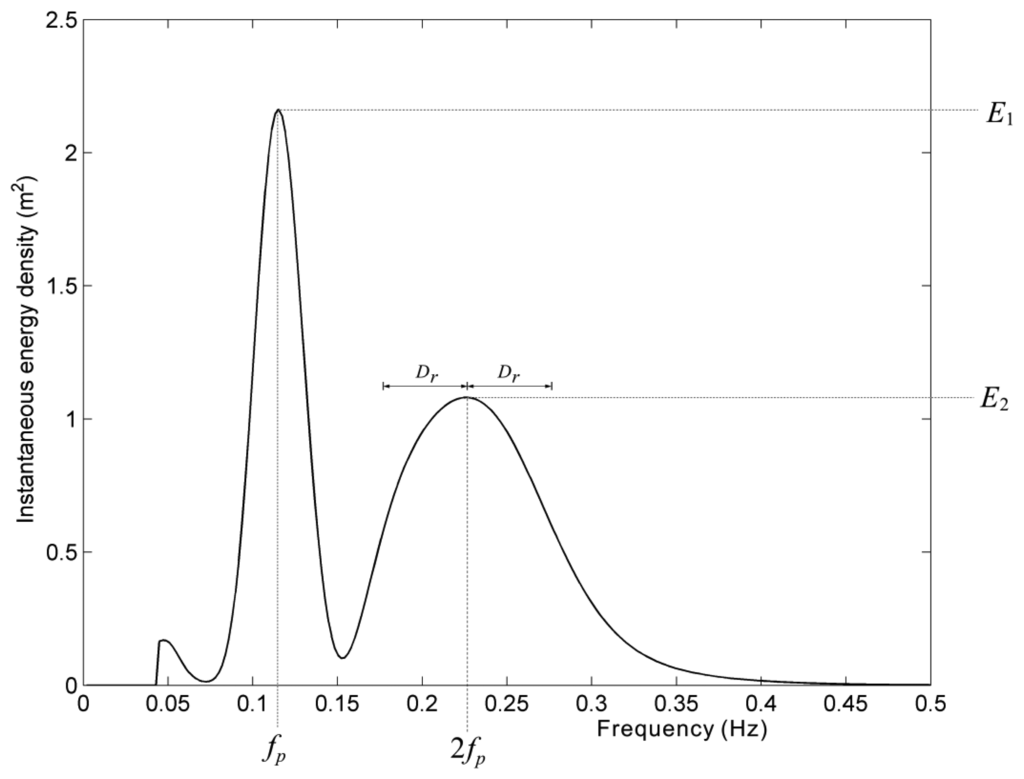 After finding the nonlinear features that existed in a wavelet spectrum like the one shown in Figure 8a, we could also examine its corresponding short-time series of sea surface elevations. The short-time wave profile was derived from the wavelet algorithm and like the one shown in Figure 8b, but it only has short-time duration and concentrates at the instant when nonlinearity occurs. Firstly, the instantaneous spectrum like Figure 9 was extracted from the wavelet spectrum at the time of one major spectral peak at fp and the other minor peak at 2fp. Since the wave nonlinearity is affected by the energy density at 2fp, the ratio Rf of the energy density E2 (as shown in Figure 9) at 2fp to the energy density E1 (as shown in Figure 9) at fp was used here to quantify the wave nonlinearity: